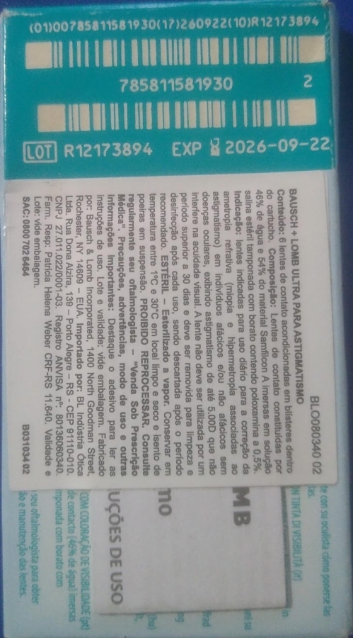 ULTRA TÓRICA CAIXA COM 6 LENTES (3 pares do mesmo grau) Correção: Miopia, hipermetropia, astigmatismo Lentes de contato gelatinosa tórica Descarte: Mensal Curva 8.6 Diâmetro: 14,5